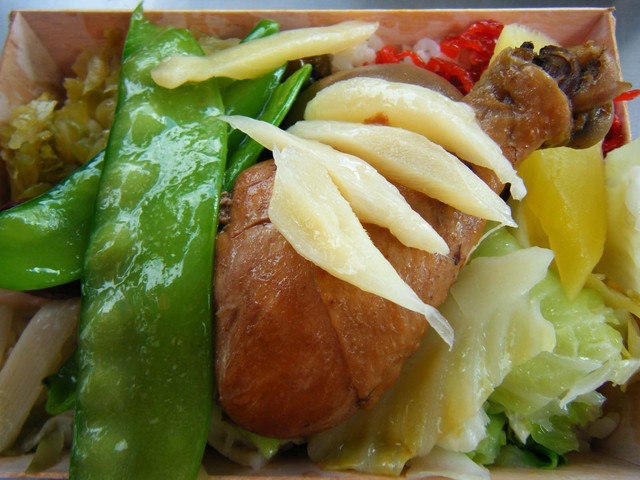 奮起湖鐵路便當,菜好清脆,很多小小的配菜藏在裡面,茶梅很好吃,邊吃邊看對面的山景,吃便當有這種景色不習慣,呵呵