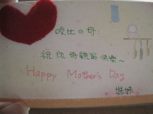 然後,我收到母親節卡片@@,是心肝代替小寶送給我的,咬比是小寶的新名字,收到卡片還不賴,好好笑,呵呵