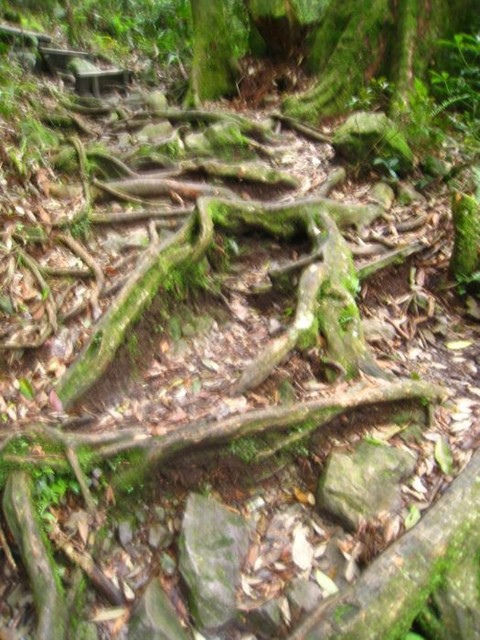 小徑滿路都是樹根盤錯,一度聽到馬路車聲,不知為何到不了,又走了好久,這段走了2個小時,似乎沒有比較近@@"