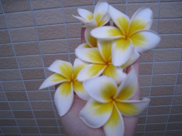 這幾個月,看到路上有很漂亮的花花掉滿一地,就請李瞇瞇陪我去撿花兒。愛撿些漂亮的葉子、果子跟花,雖然撿回家常不知道夾在哪本書裡就不見了;以前上課時,有個很帥的奧地利老師還會很珍惜的用保鮮盒裝起來。這次看到的是原產熱帶的雞蛋花,名字有點古怪,花美名不美,但是甜甜清香四溢,有南洋的活力,很適合送給小寶跟熊熊還有我。