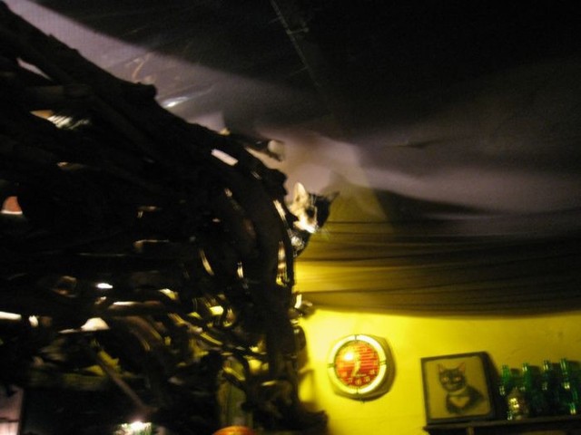 六號貓洞是間很有特色的店,順著樹跟房子打造,前面是鐵道還有公園,許多隻店貓自由的來去,正妹老闆穿著無袖洋裝,放著悠閒的音樂,喝杯咖啡、飲料或啤酒,加上濛濛燈光,這裏好像是奇幻的鐵道旁小店。